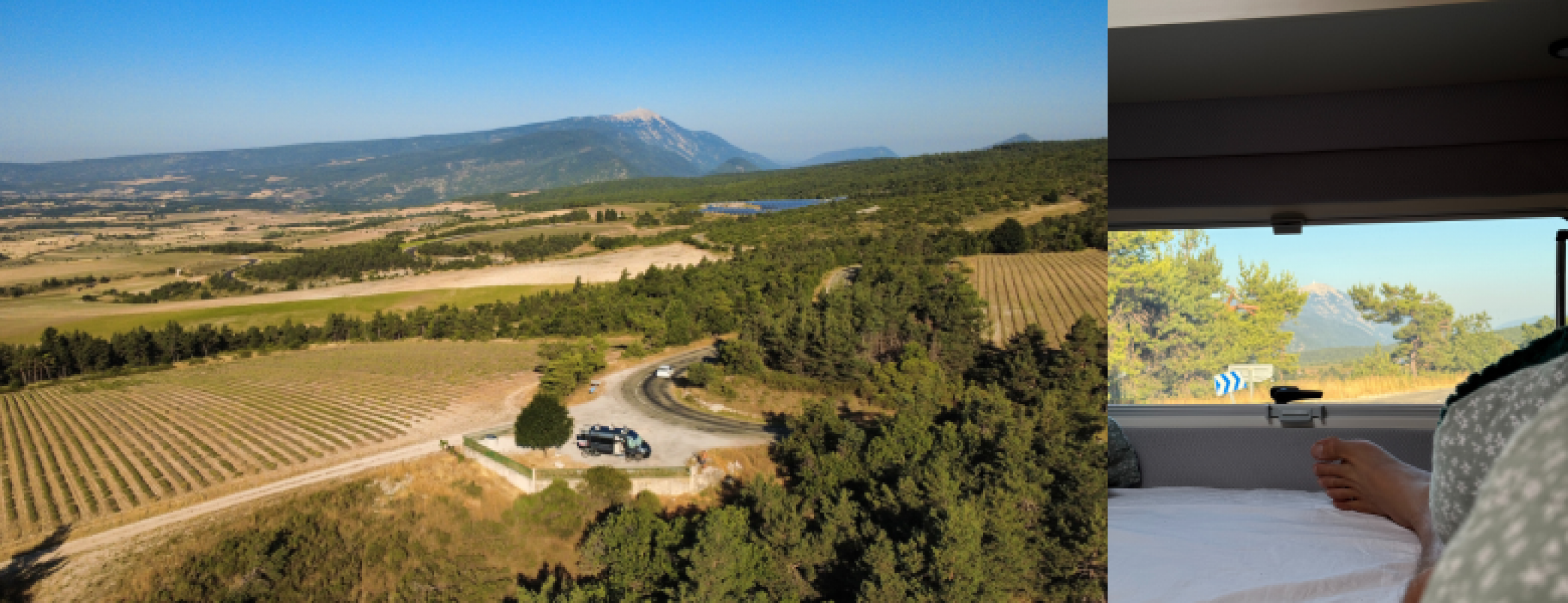 Zjutraj sva šele zares dojela, kako čudovito lokacijo sva izbrala za nočitev – nad sivkinimi polji, z odprtim razgledom na Provanso in mogočni Mont Ventoux, ki se je bohotil približno 20 km stran. 🌄