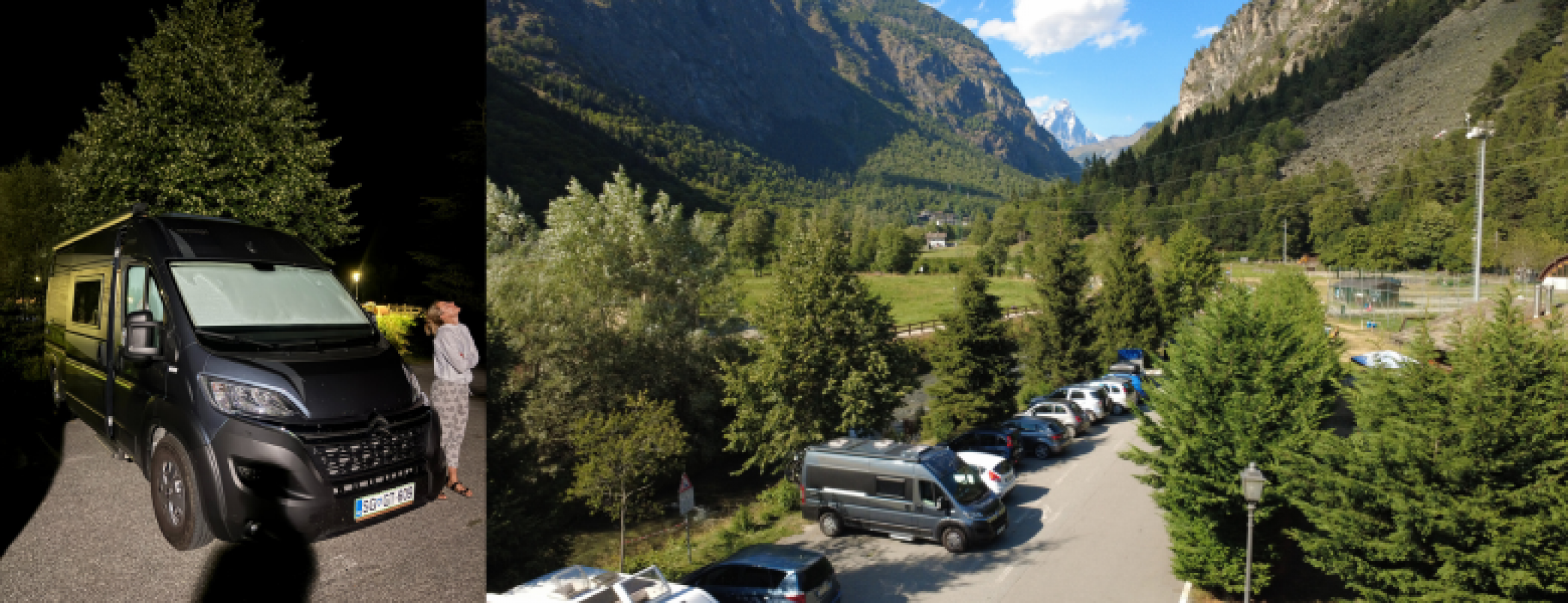 Ob 9.00 sva prevzela avtodom Hiše na kolesih v Šenčurju, se v Mariboru spakirala in ob 15.00 uri štartala proti dolini Aoste na severozahodu Italije. Po desetih urah vožnje sva se parkirala približno 20 km pod mestom Breuil-Cervinia in slovitim Matterhornom. Parkirno mesto sva našla preko aplikacije Park4Night, ki nama je na poti služila za iskanje kampov in postajališč za avtodome.