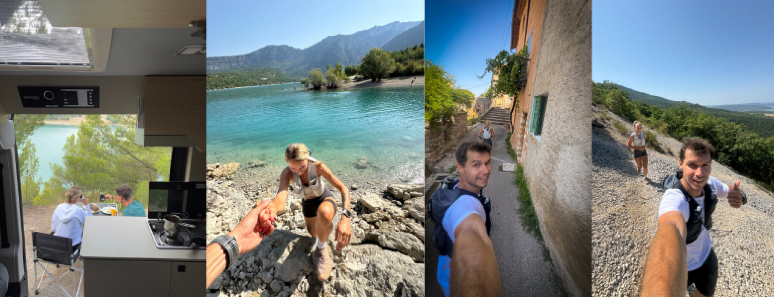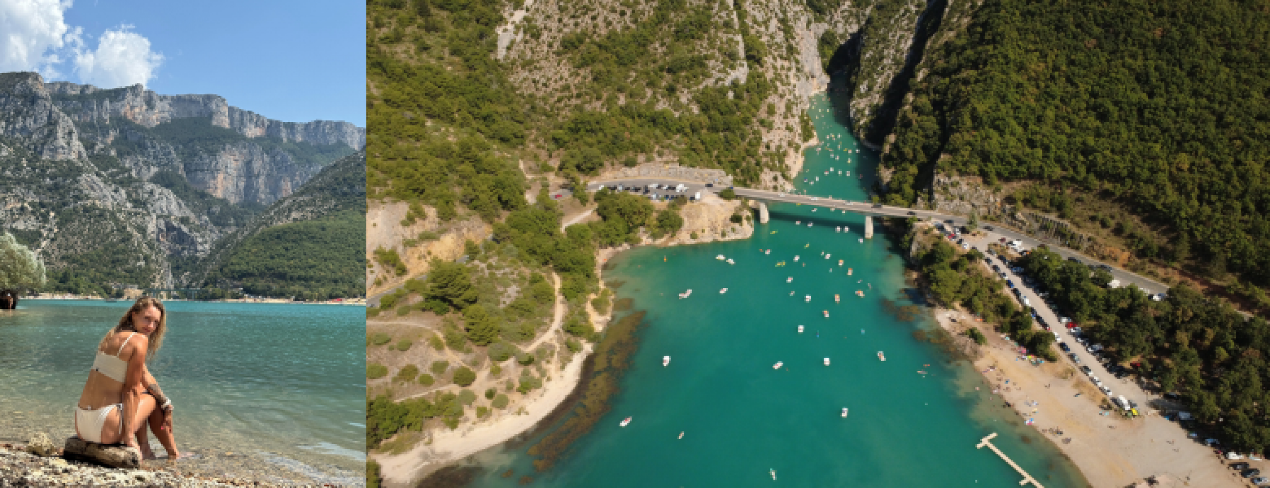 Po teku sva se od parkirišča spustila do jezera in se osvežila v turkizno modri vodi. Gre za izjemno priljubljeno poletno destinacijo – jezero je bilo polno plovil na vesla in veter. Nahajava se v območju Gorges du Verdon, kjer reka, ki napaja jezero, sega globoko v skale. To območje je raj za raziskovanje s supom, kajaki in podobnimi plovili.