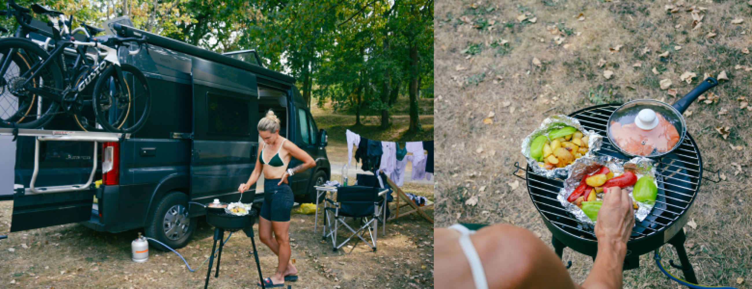 Po kolesarjenju sva se osvežila v potoku, pripravila kosilo in ga pojedla na kamping opremi, ki sva jo prejela v okviru najema avtodoma.