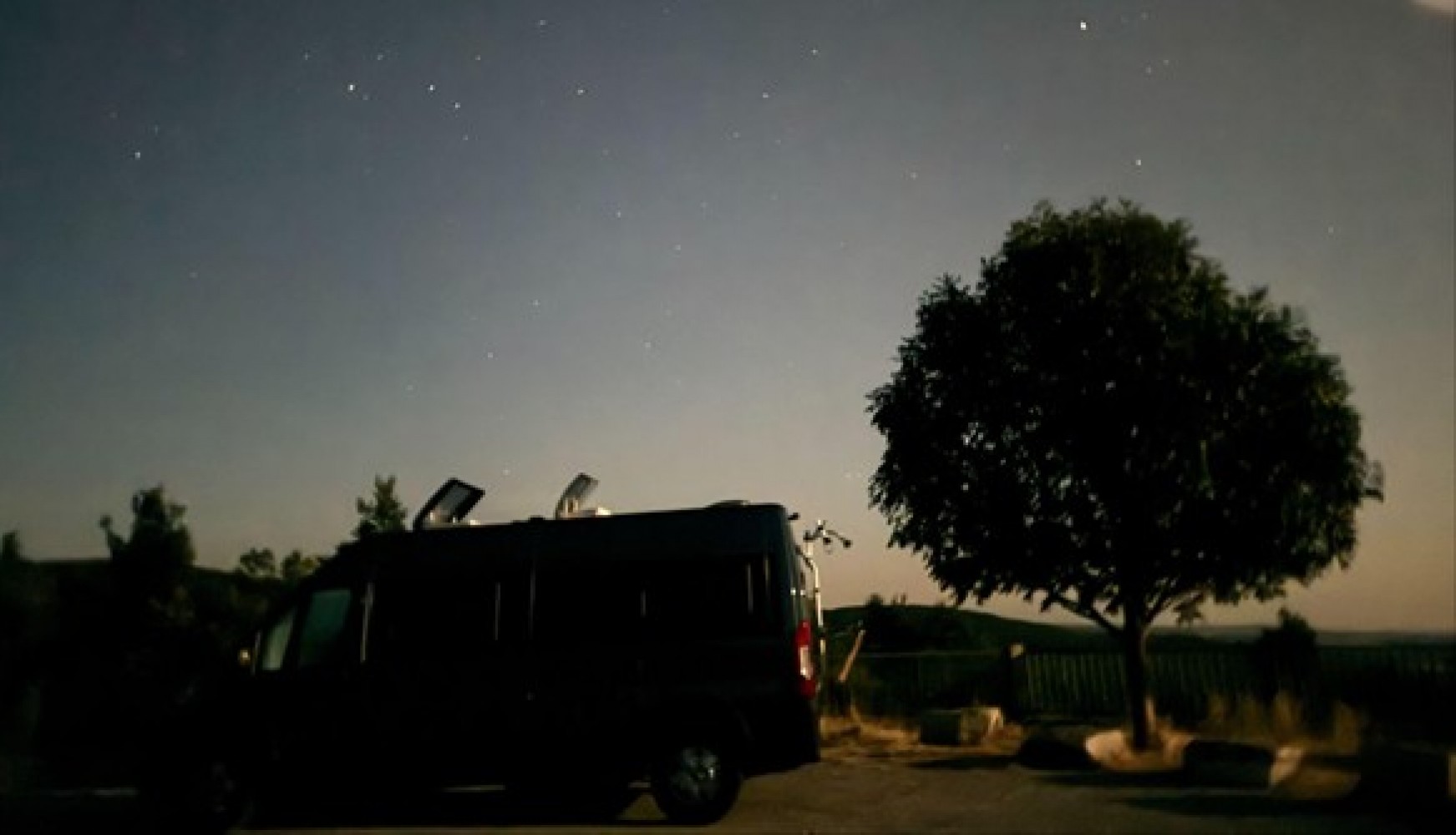 Ker naju je naslednji dan čakal vzpon na najvišji vrh Andore – Comapedrosa – sva se podala proti izhodišču v smučarsko središče Arinsal. Parkirala sva ob cesti (📍 CS-413, AD400 La Massana) na lokaciji iz Park4Night. Ob nama je bila parkirana skrivnostna visoka prikolica brez oken – nisva ji posvečala pozornosti, dokler se ni okoli 22:30 začel pravi light-show z modrimi lučmi.